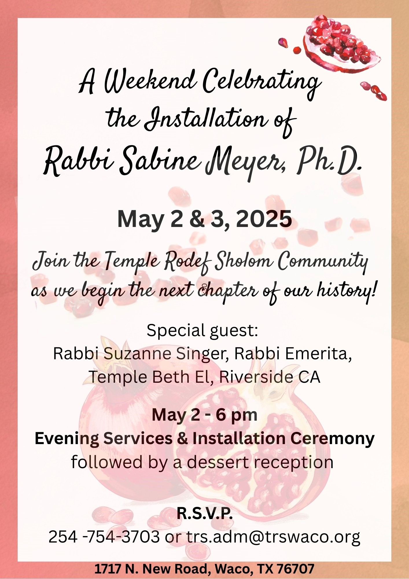 On Friday, May 2nd, at 6 pm, our friends at the Temple are hosting a service in honor of their spiritual leader, Rabbi Sabine Meyer. The time conflicts with our own services at CAJ, but in case anyone wishes to attend the event at TRS, in the spirit of Jewish unity, here is the information: https://agudathjacob.org/wp-content/uploads/2025/04/Sabine-installation.jpg.